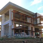 To begin with, a belt of monolithic concrete is made , approximately twenty centimeters high. The ceilings are inserted into this belt approximately eight centimeters deep, and the space is filled with blocks. The reinforcing mesh is laid out on top of the blocks and beam elements. Next, this surface is filled with concrete.