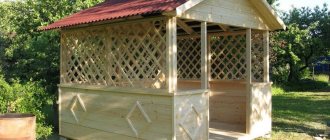 Cross section of a wooden gazebo. In the photo on the right - how to make raised roof ends