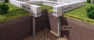 The foundation is laid on a sand and gravel cushion, reinforced with reinforcement, and covered with a waterproofing layer