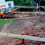 To do this, you can use pegs and construction cord. If it is planned to subsequently install a solid fuel stove in the house, its supporting base is included in the foundation plan and is carried out together with the main structure. Marking for pouring the foundation is done using cords and pegs. It is necessary to check the equality of the diagonals of the resulting quadrilateral - Dig a trench according to the established markings to the designed depth.