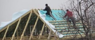 - Постелите и прибейте к стропилам полотно для гидроизоляции (оно предотвратит намокание теплоизолятора). Каждую полосу укладывайте до 200 мм внахлест и склеивайте с помощью скотча (покрытие должно получиться максимально герметичным).