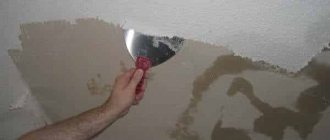 Если строительные огрехи незначительны, поверхность практически ровная, имеются лишь небольшие трещинки и щели, потолочную поверхность шпаклюют, нанося слой 3-4 мм. В промежуточных случаях выравнивание выполняют оштукатуриванием.